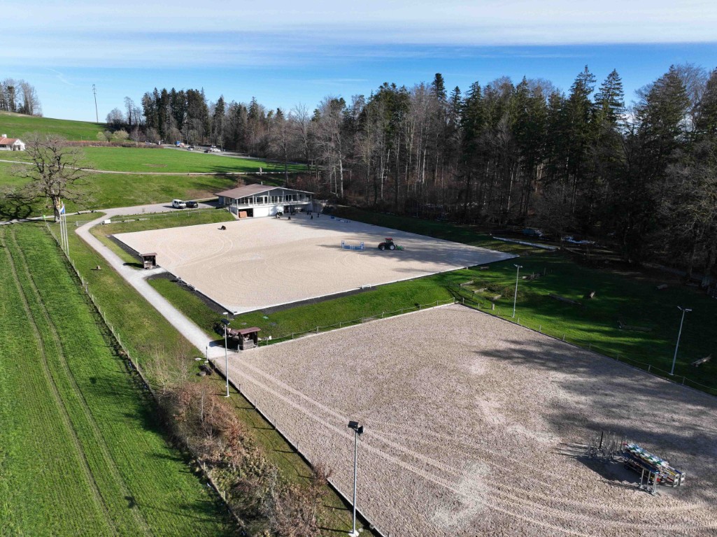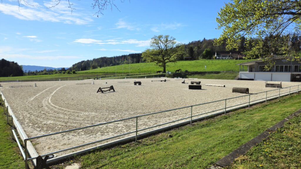 Er ersetzt den Rasenreitplatz, welcher den Ansprüchen leider nicht genügen konnte. Er verfügt über eine Reitfläche von rund 4’000m2.